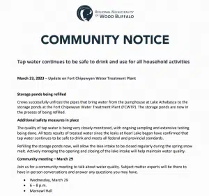 In an RMWB post, the Municipality said they have implemented additional safety measures and enhanced testing at the Fort Chipewyan Water Treatment Plant, and Tap water continues to be safe to drink and use for all household activities