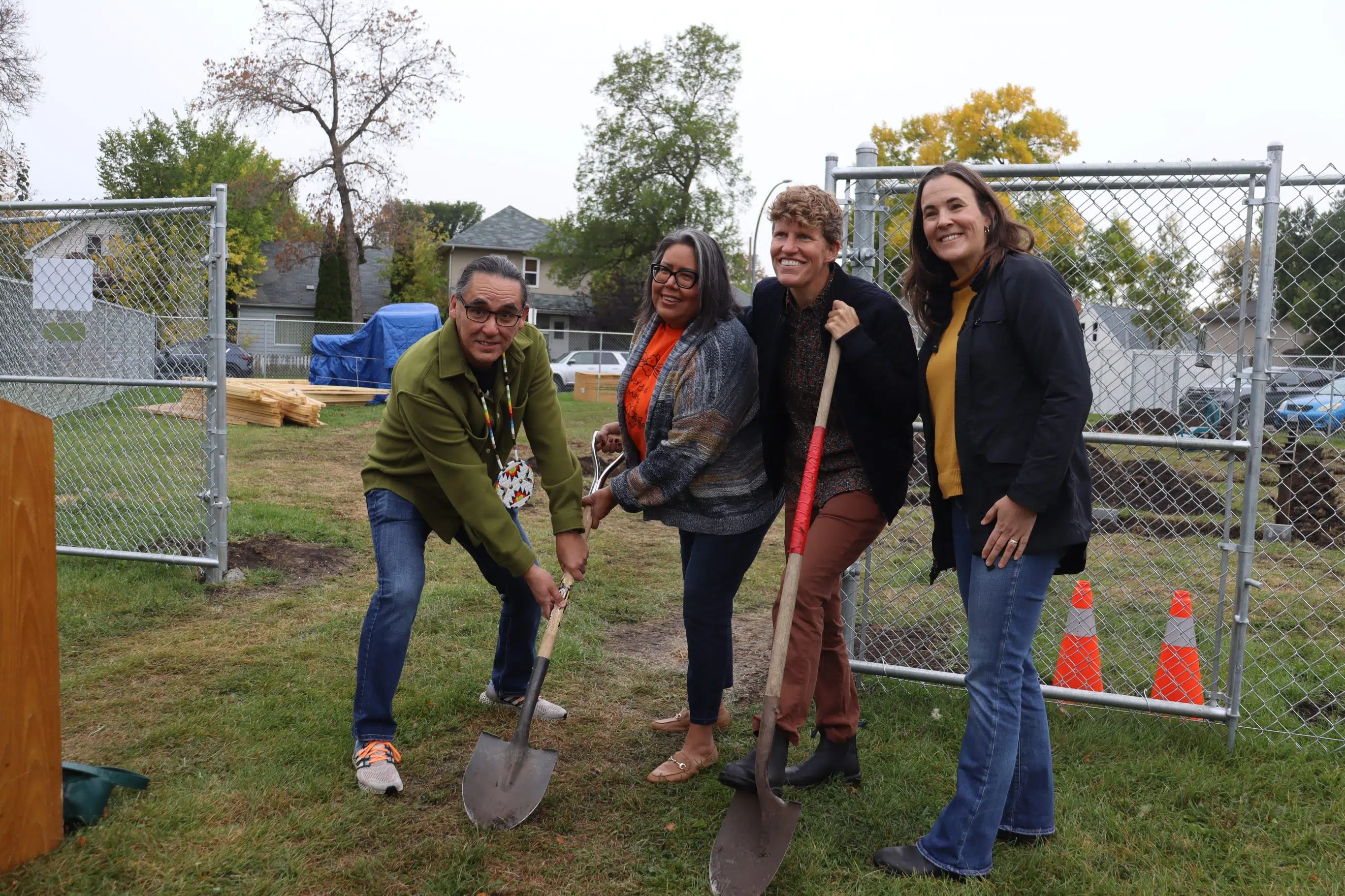 Left to right: Senior Manager Lloyd Yellowbird, Executive Director Cheryl Whiskeyjack, Edmonton-Highlands-Norwood MLA Janis Irwin, and Calgary-Currie MLA Janet Eremenko hold the shovels to mark the beginning of construction for Bent Arrow's sweat lodge. Photo by Ryan Hunt.