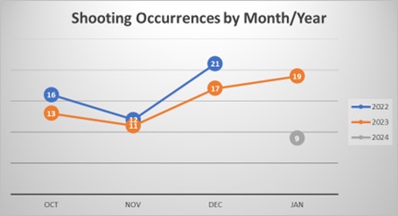 Compared to January 2023, which recorded a total of 19 shootings, occurrences were down 53% in January 2024. Over the past four months they have seen shooting occurrences trend downward compared to the previous year: