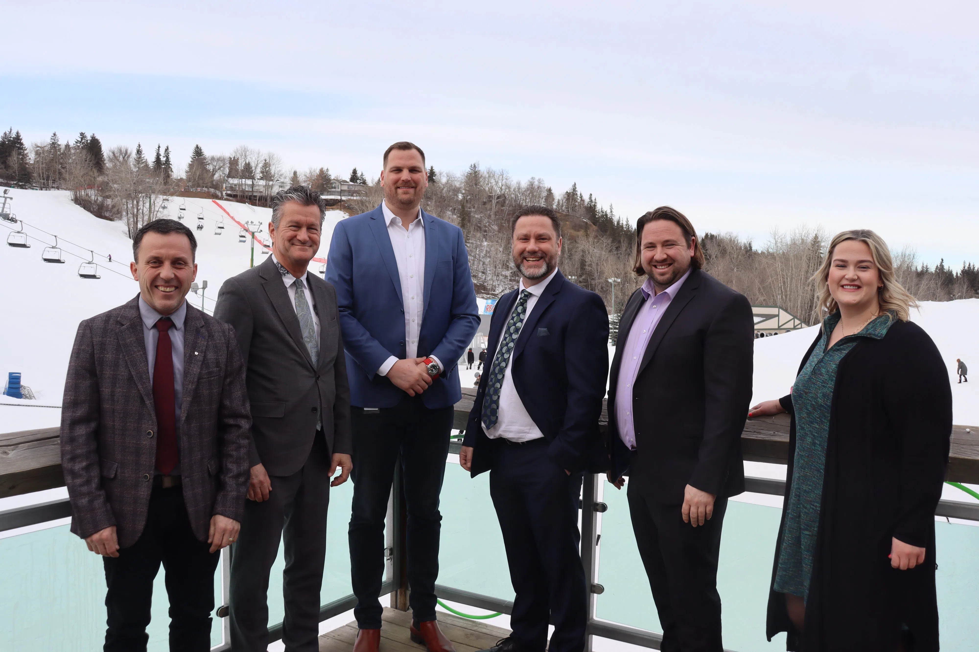 From left to right: Josh Crick, MD of Bonnyville councilor; Craig Copeland, Mayor of Cold Lake; Joseph Schow, Minister of Tourism and Sport; Scott Cyr, MLA for Bonnyville-Cold Lake-St. Paul; Nick Werstiuk, Mayor of Glendon; Kayla Blanchette, Town of Bonnyville councillor. Photo by Ryan Hunt.
