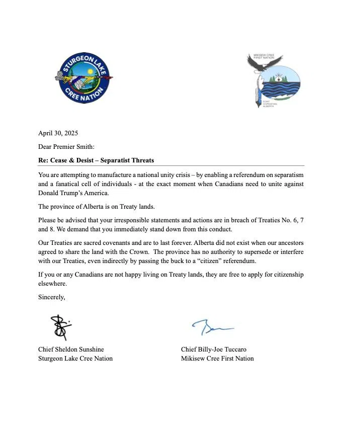 Two Alberta First Nation chiefs send cease and desist letter to Premier Smith over separatist talk