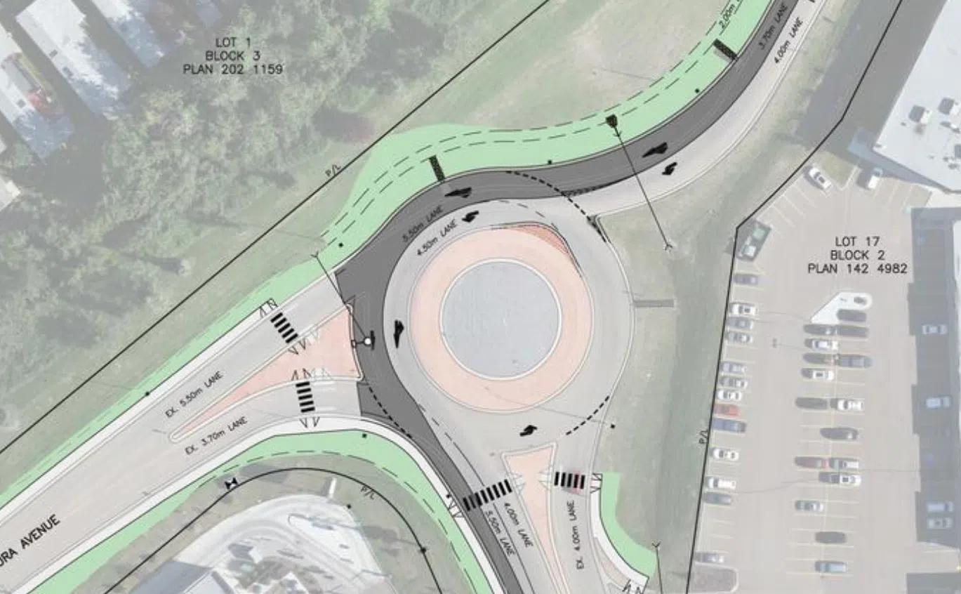 The planned work in the roundabout includes relocating street lighting and catch basins; upgrading the granular base and asphalt pavement; installing new concrete curbs and sidewalks; refreshing road markings; and restoring landscaping.
