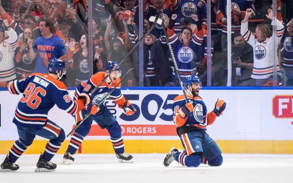 Edmonton Oilers' Adam Henrique (19), Jake Walman (96) and Zach Hyman (18) celebrate a goal against the Vegas Golden Knights during first period round 2, game 4 NHL Stanley Cup playoff action in Edmonton, Monday, May 12, 2025. THE CANADIAN PRESS/Jason Franson