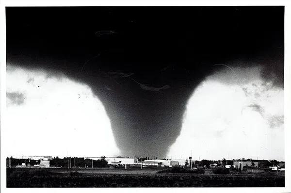 Around 3 p.m. that day, a dark funnel cloud touched down in southeast Edmonton. As it cut a 37-kilometre swath of destruction through the eastern part of the city, eyewitnesses described a roaring sound “like a freight train” as 400 kilometre-per-hour winds exploded buildings and tossed cars around like toys.