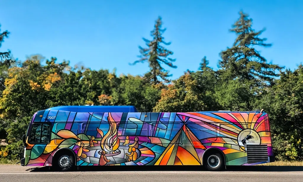 This bus wrap is one step in the city’s ongoing journey of reconciliation and reflects the city’s commitment to the Indigenous Framework and to working in good relations with First Nations, Inuit and Métis Peoples.