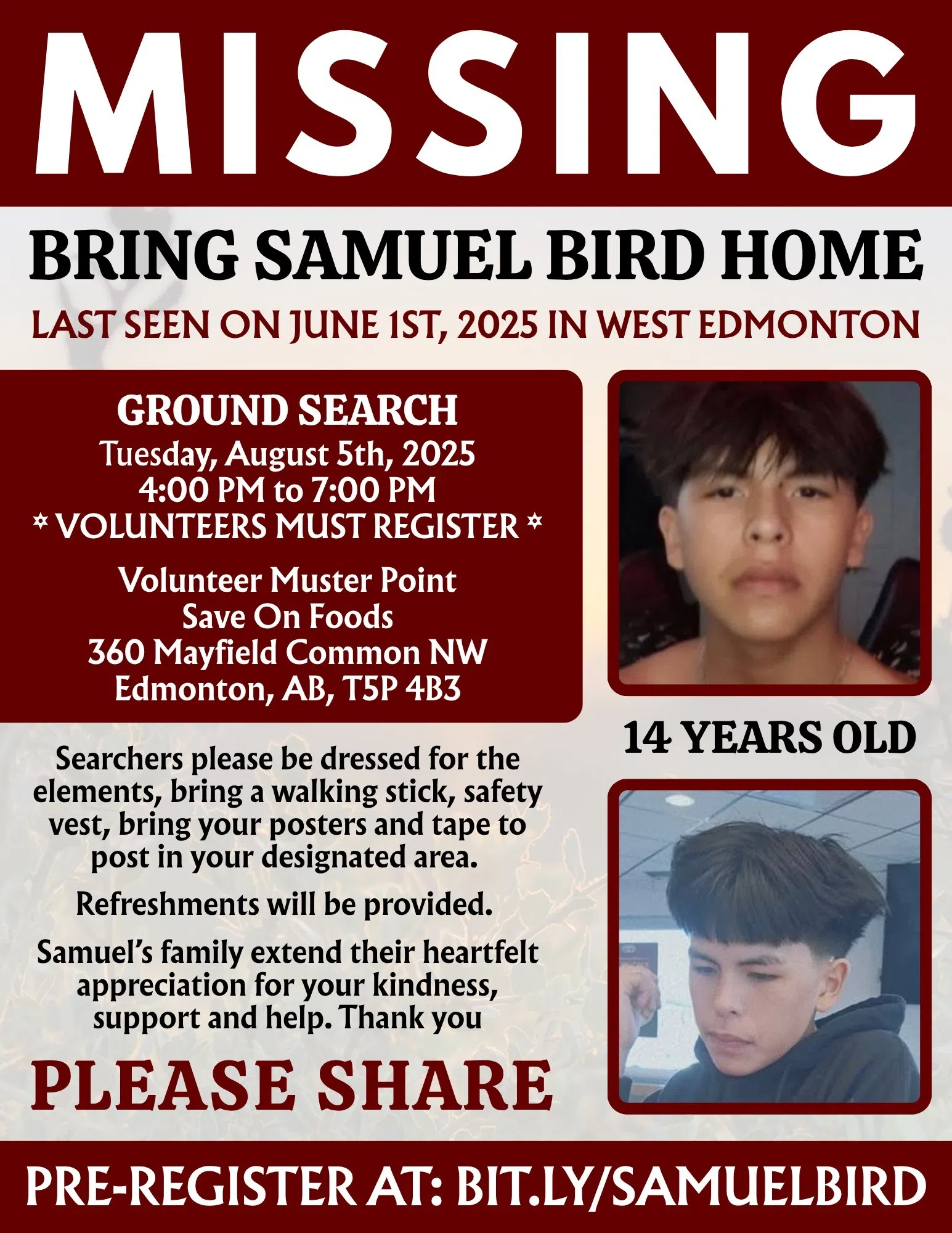“Every day since Samuel’s disappearance four months ago, my family and I have been searching for my son — we have not been sitting back idly, waiting for answers,” says father Justin P Bird. ”To my family, volunteers, friends, advocates, EPS, the Confederacy of Treaty No. 6 First Nations and my community Paul First Nation — thank you for your support. We want to find Samuel and get him the justice he deserves. I love my son and I miss him.”