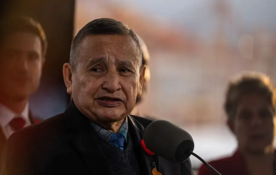 Grand Chief Stewart Phillip speaks1 during a news conference for an announcement of funding to Indigenous led conservation in B.C. at the 2023 B.C. Cabinet and First Nations Leaders’ Gathering in Vancouver, on Friday, Nov. 3, 2023. THE CANADIAN PRESS/Ethan Cairns