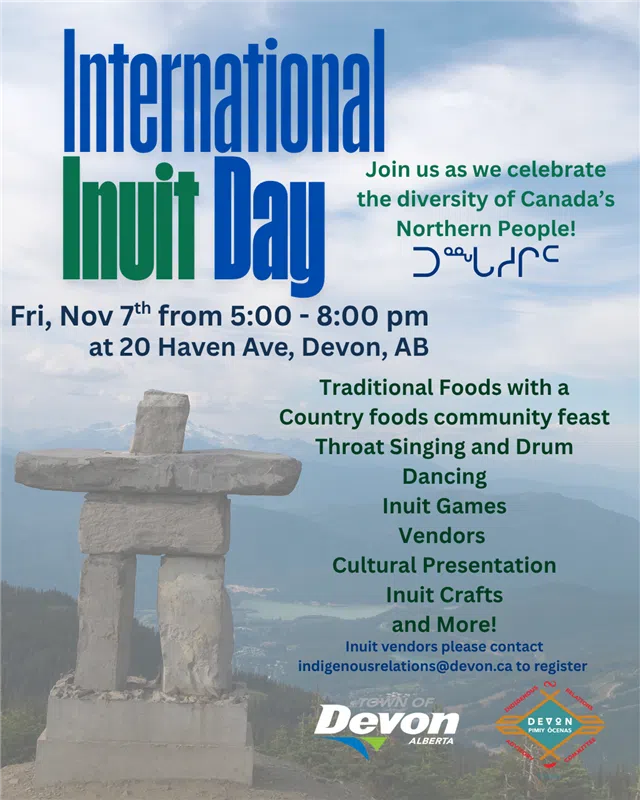 International Inuit Day is celebrated on November 7th. On this day, we honour the culture, identity and contributions of Inuit people globally. On Friday, the Devon Community Centre will be holding th...