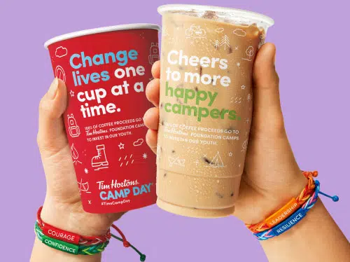 On Camp Day®, 100% of proceeds from hot and iced coffee sales are donated to Tims® Camps. Guests can also purchase Camp Day® bracelets and other merchandise, or donate in-restaurant through Round Up, coin box or through a monetary cash register donation. Camp Day® is more than just a fundraiser. It’s a national movement supported by celebrities, sports teams, influencers, political leaders and community figures who unite to raise awareness and funds for youth who need our support.